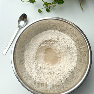 Zunächst verrühre ich das Mehl (oder die unterschiedlichen Mehlsorten) mit dem Salz (auch bei süßem Gebäck verwende ich eine großzügige Prise Salz) und ggf. den Gewürzen in einer Schüssel.